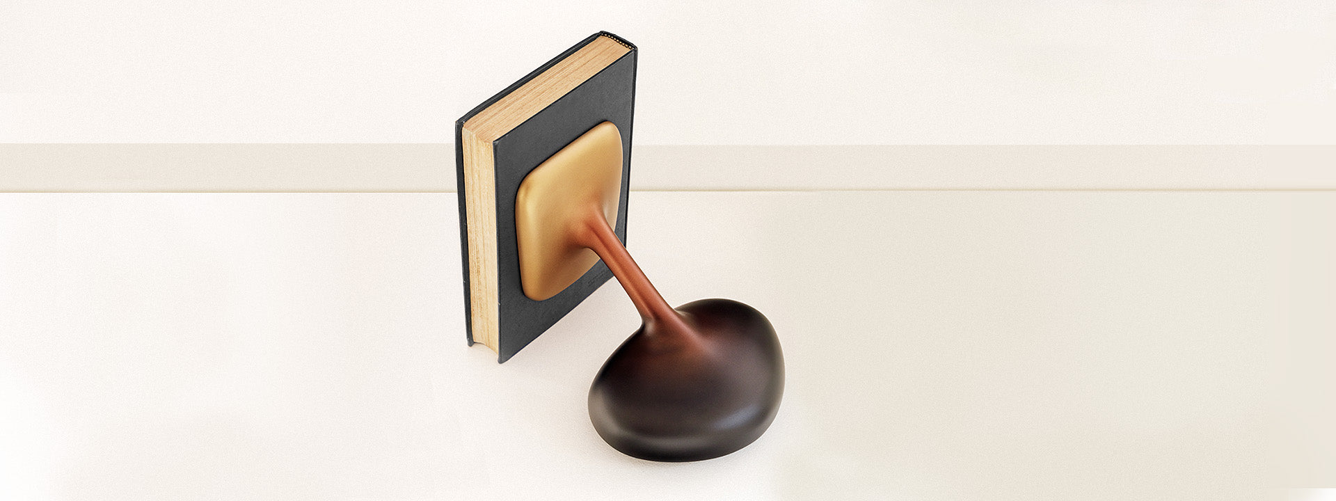 Apoio de livros que explora a transição formal entre volumes. A base arredondada se afunila em direção à superfície de apoio, criando uma silhueta orgânica onde a função se integra à forma escultórica.