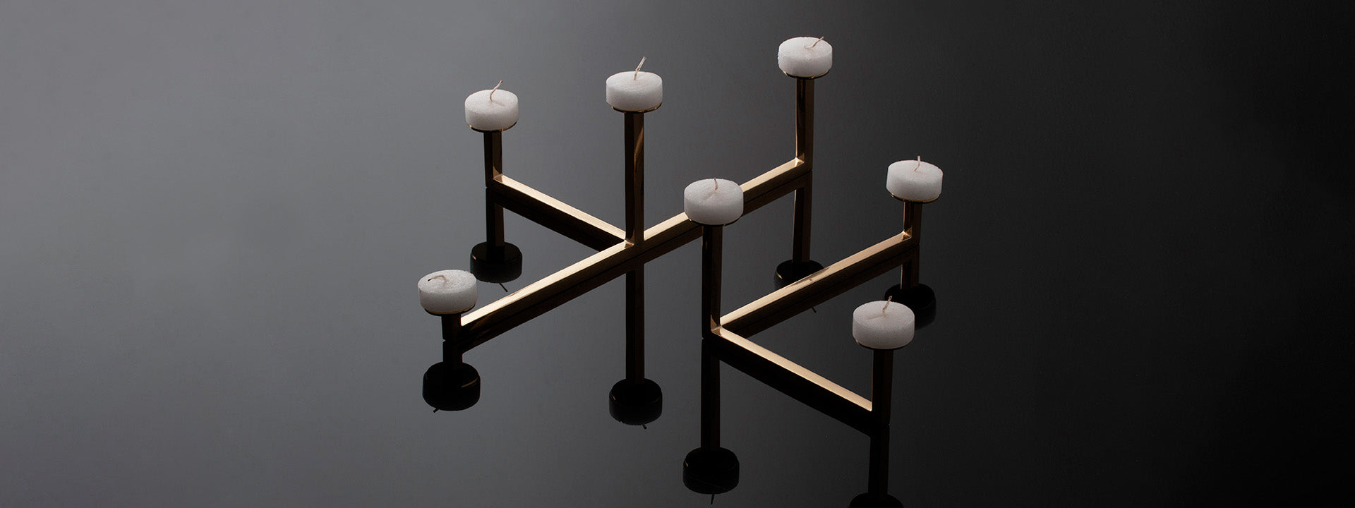 Castiçal onde linhas retas se encontram formando ângulos precisos. A peça explora o diálogo entre geometria e design, criando uma estrutura onde cada segmento contribui para o equilíbrio do conjunto, questionando se é a forma que define a função ou o contrário.