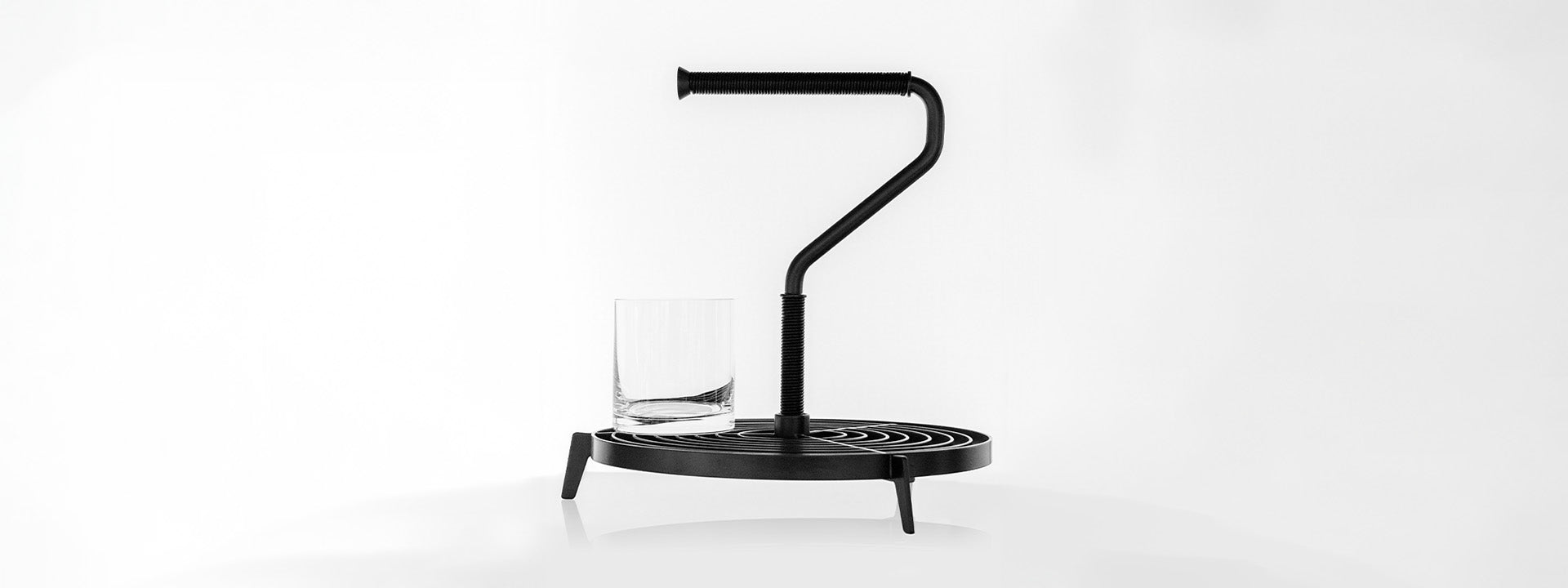 O Suporte Wisk combina estrutura metálica e detalhe em cordão de couro, resultando em uma peça resistente e refinada.